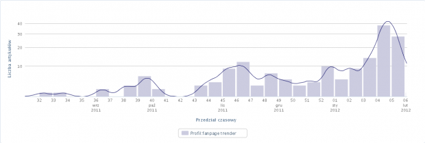 Właśnie na dobrze wykorzystaną okazję. Fanpage Trender w pełni zaprezentował swoje możliwości narzędzia analizującego komunikację na Facebooku, robiąc raport na temat kasowania postów przez Kancelarię Premiera. Znalazł się na ustach wielu dziennikarzy, raport opisało sporo mediów. Za pośrednictwem dziennikarzy dowiedział się o nim sam premier, który jeszcze musiał się tłumaczyć z kasowania postów. Rzuciłam sobie jednym okiem w NewsPointa i dane dotyczące samych portali. Na wykresie widać liczbę artykułów zawierających frazę „fanpage trender” – wyraźna górka pod koniec stycznia to właśnie czas publikacji raportu o kasowaniu komentarzy.
